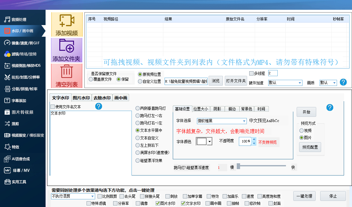 打开智兔软件,登录,然后点击左侧栏的第二个功能“水印”。将视频拖动到“可拖拽视频、视频文件夹到这里”的这块区域,然后,可以看到水印的编辑分为了“添加水印”和“去除水印”。我先讲“添加水印”应该如何使用。“添加水印”分为“文字水印”和“图片水印”,其中,图片水印点击“浏览”导入,水印放置的位置在可选的四个角上,文字水印可以是英文或中文,不同的语言要选择不同的字体,文字水印可以编辑并且位置可以点击预览配置去按照自己的想法移动放置在视频中的任意位置。水印的添加一次只能选择一种水印类型(图片、文字)。都选择好之后,点击开始,视频就正在编辑了。当编辑好之后,编辑过的视频会保存在文件夹里并放置在原视频所在的地址中。