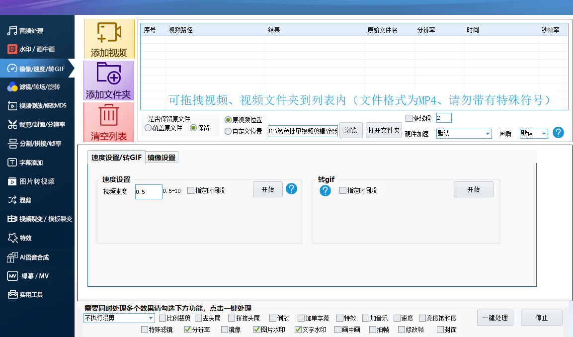 首先打开软件,登录,点击左侧栏的第三个功能:镜像/速度,并将视频导入。然后,我要先讲的是智兔中改变视频速度的用法。看到“速度设置”的“视频速度”,在填写数字的框的旁边有“0.5-10”这样的数字,其实,它的意思是,1>视频≥0.5是放慢视频速度,10≥视频>1是加快视频速度,也就是说,“1”是视频本身的速度,小于1,视频放慢,并且数值越小,速度越慢;大于1,视频速度变快,并且数值越大,速度越快。同样,点击“开始”编辑并以文件夹的方式导出视频到视频所在的路径。