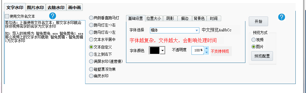 3.如果是添加文字水印,那么就把文字输入,然后调整字体大小,阴影大小,文本位置也填一下,然后选择字体格式,比如要什么背景,字体要什么颜色等,然后点击预览配置,如果是自己想要的效果,点击开始即可。