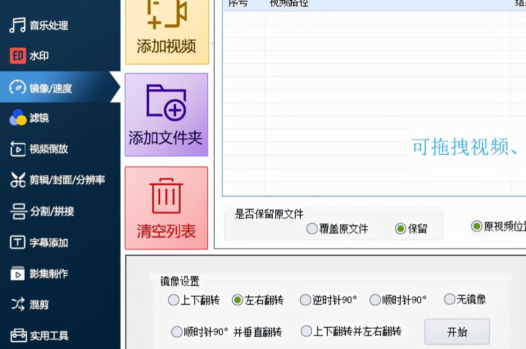 然后根据自己的需要选择镜像设置,可以上下翻转,左右翻转,也可以做顺时针逆时针旋转等等。选择好要处理的效果之后,点击开始,就可以一键批量产出视频了,是不是很简单呢。