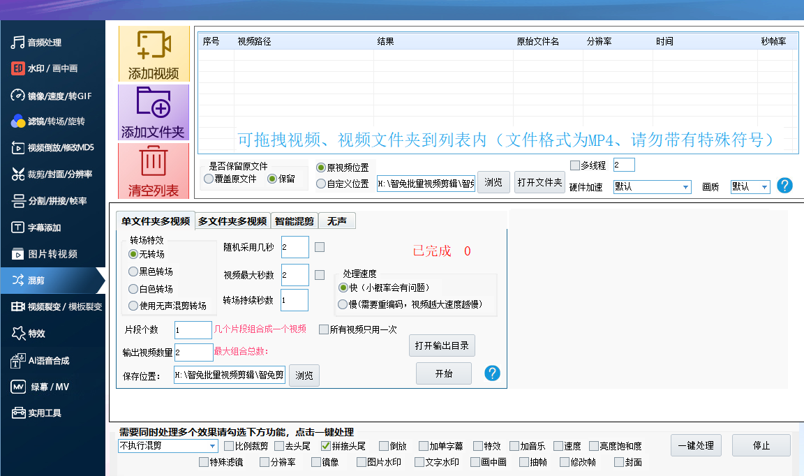 至于难易程度,批量导出视频时,只需将原视频文件夹导入,并在每个选项中设置并勾选,然后点击一键处理,就可以批量导出视频了。