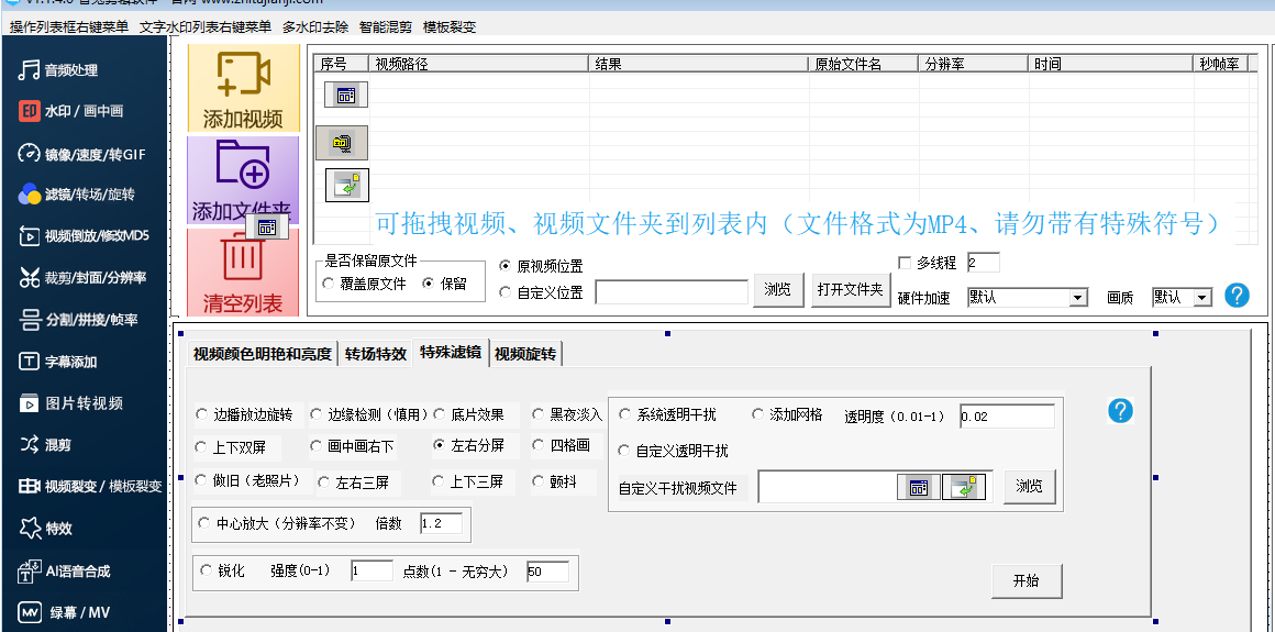2.找到并点击左边的滤镜功能栏,然后在特殊滤镜功能栏里找到左右分屏按钮(如上图所示),然后点击开始,等待处理就可以了。
