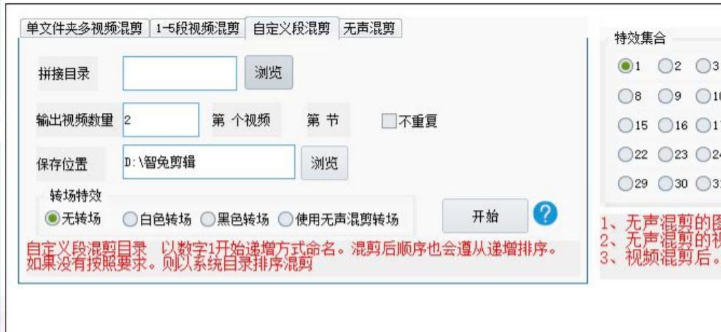 接下来是自定义段混剪,如果我们视频素材的文件夹数量大于5个的话,就用这个功能,我们要做一个总文件夹,总文件夹里面放视频素材文件夹,视频素材文件夹里面要有视频素材,这些视频素材文件夹我们给他命名1,2,3,4……,然后把总文件夹拉到拼接目录这边,输出视频数量填写一下,视频是否要重复选择一下,然后就是转场特效要使用哪种。这些选择好之后,点击开始就可以了。