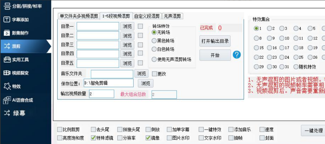 最后是无声混剪,如果图片或者视频,要做很多种转场特效,可以使用这个功能来处理。